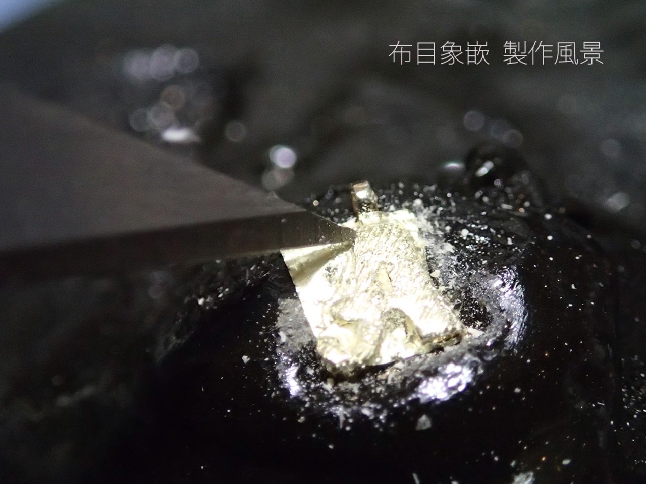 目切り鏨(めきりたがね)を使い、金属の表面を布目状に彫り刻み金箔などを嵌め込む技術で、